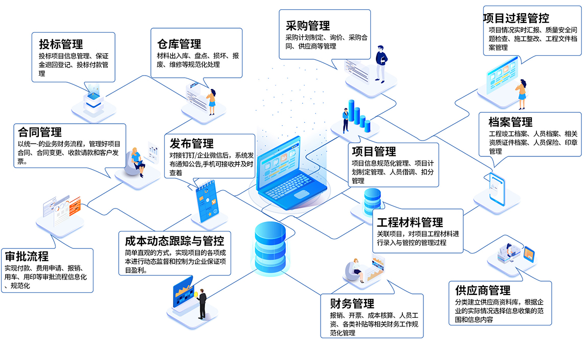 數(shù)字化管理系統(tǒng)對企業(yè)工程項(xiàng)目從項(xiàng)目投標(biāo)中標(biāo)、項(xiàng)目過程管理、合同管理、物資設(shè)備管理、采購管理、項(xiàng)目過程管理、施工隊(duì)管理、供應(yīng)商、成本核算等進(jìn)行全面綜合管理;縱向貫穿投標(biāo)、采購、施工、竣工的全過程,橫向涉及公司內(nèi)部的各相關(guān)崗位,是一套全方位、集成的企業(yè)項(xiàng)目綜合管理平臺。通過對成本、進(jìn)度、質(zhì)量、安全等方面的控制,以及對合同、結(jié)算、支付、資金等要素的管理,來提高工程類企業(yè)對工程項(xiàng)目的綜合配套能力。